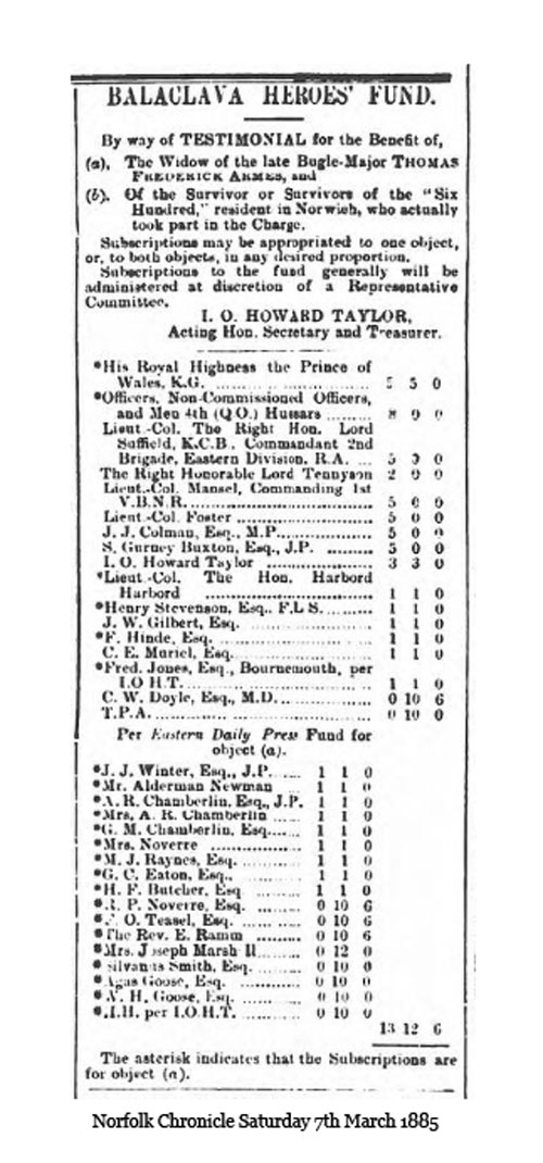 Additional information about membership of the Balaclava Commemoration Society and a newspaper cutting fro 1885 kindly provided by Chris Poole.