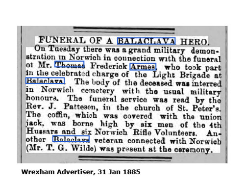 "Died at All Saint's Green, Norwich, Thomas Frederick Armes, Bugle Major of the 1st Volunteer Battalion of the Norfolk Regiment. Formerly in the 4th Light Dragoons, he took part in the famous light cavalry charge at Balaclava, in which he was wounded and left for dead on the field."