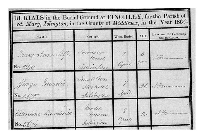 Burials in the Burial Ground at Finchley, for the Parish of St Mary, Islington, in the County of Middlesex, in the Year 1864: Valentine Bambrick, no. 5676, [abode] Model Prison Islington, [buried] 8 April, [age] 25.