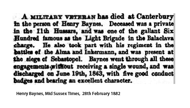 "On Wednesday last (the 15th inst.) Henry Baynes, late of the 11th Hussars, died at Canterbury. He rode in the famous charge of the Light Brigade at Balaclava, was also at the battles of Alma and Inkerman and went through these engagements without receiving a single wound. He had served with the regiment for twenty-five years".