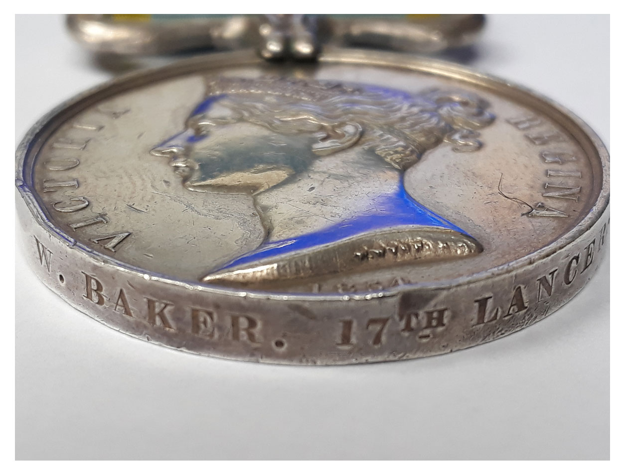 A Charge of the Light Brigade Casualty Crimean War Medal with Sebastopol, Balaklava and Alma Clasps to W. Baker, 17th Lancers. Officially impressed. Complete with ribbon. Private William Baker enlisted for service with the 17th Lancers in 1842 and was killed in the Charge of the Light Brigade on Oct 25th 1854. His death is confirmed by four major sources as having been killed on that day.
