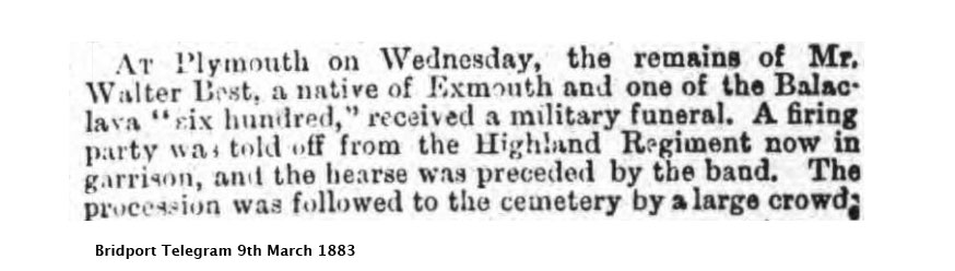 Born in the neighbourhood of Exmouth 55 years ago, the deceased enlisted in 1843 into the 4th Light Dragoons, being "One of the Six Hundred" in the engagement at Balaclava on the memorable October 25th, 1854.