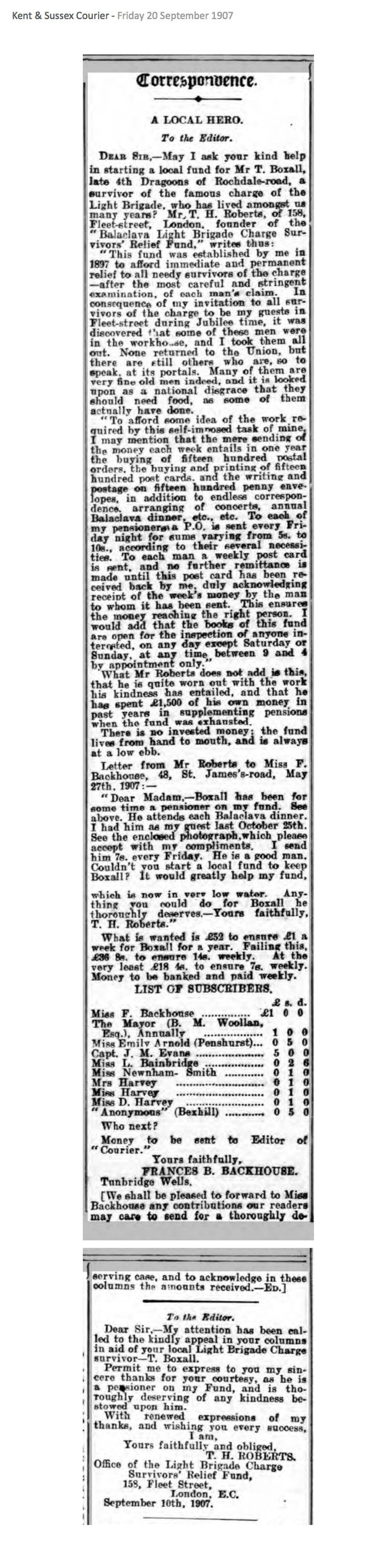 "Henry [sic] Boxall lived until August of 1914 and died, aged 88 years, just as the country was preparing to plunge into the Great War. As a result, the passing of this hero of the "Charge" was over-whelmed by greater events.