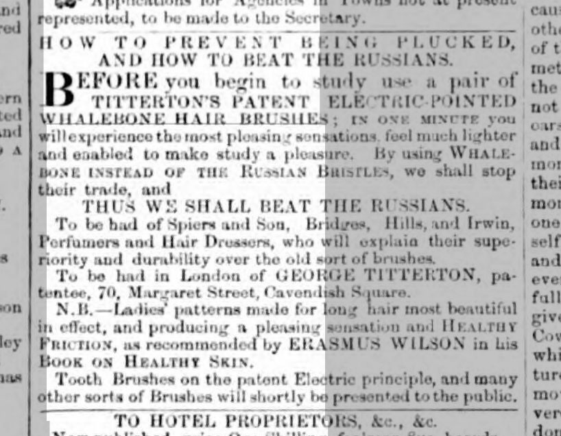 BEFORE you begin to study use a pair of TITTERTON'S PATENT ELECTRIC POINTED WHALEBONE HAIR BRUSHES; IN ONE MINUTE you will experience the most pleasing sensations, feel much lighter and enabled to make study a pleasure. By using WHALEBONE INSTEAD OF THE RUSSIAN BRISTLES, we shall stop their trade, and