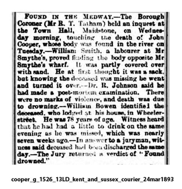 This report states that GC had been missing for seven weeks, and hints at a sacking and drunkenness (though which came first is not stated). Notice his name is given as "John" Cooper. The verdict — "found drowned" — is perhaps evasive.]FOUND IN THE MEDWAY.