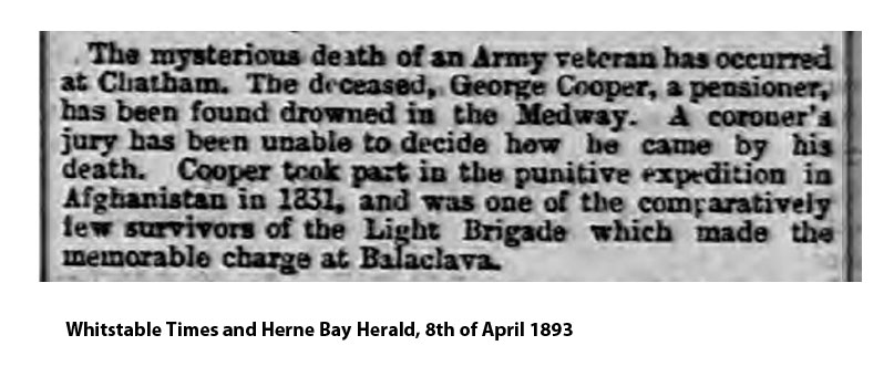 The mysterious death of an Army veteran at Chatham. The deceased, George Cooper, a pensioner, has been found drowned in the Medway. A coroner's jury has been unable to decide how he came by his death. Cooper took part in the punitive expedition in Afghanistan in 1831 [actually 1841], and was one of the comparatively few survivors of the Light Brigade which made the memorable charge at Balaclava.>