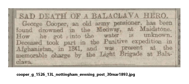 George Cooper, an old army pensioner, has been found drowned in the Medway, at Maidstone. How he got into the water is unknown. Deceased took part in the Punitive expedition in Afghanistan in 1841 [sic], and was present at the memorable charge by the Light Brigade at Balaclava.>