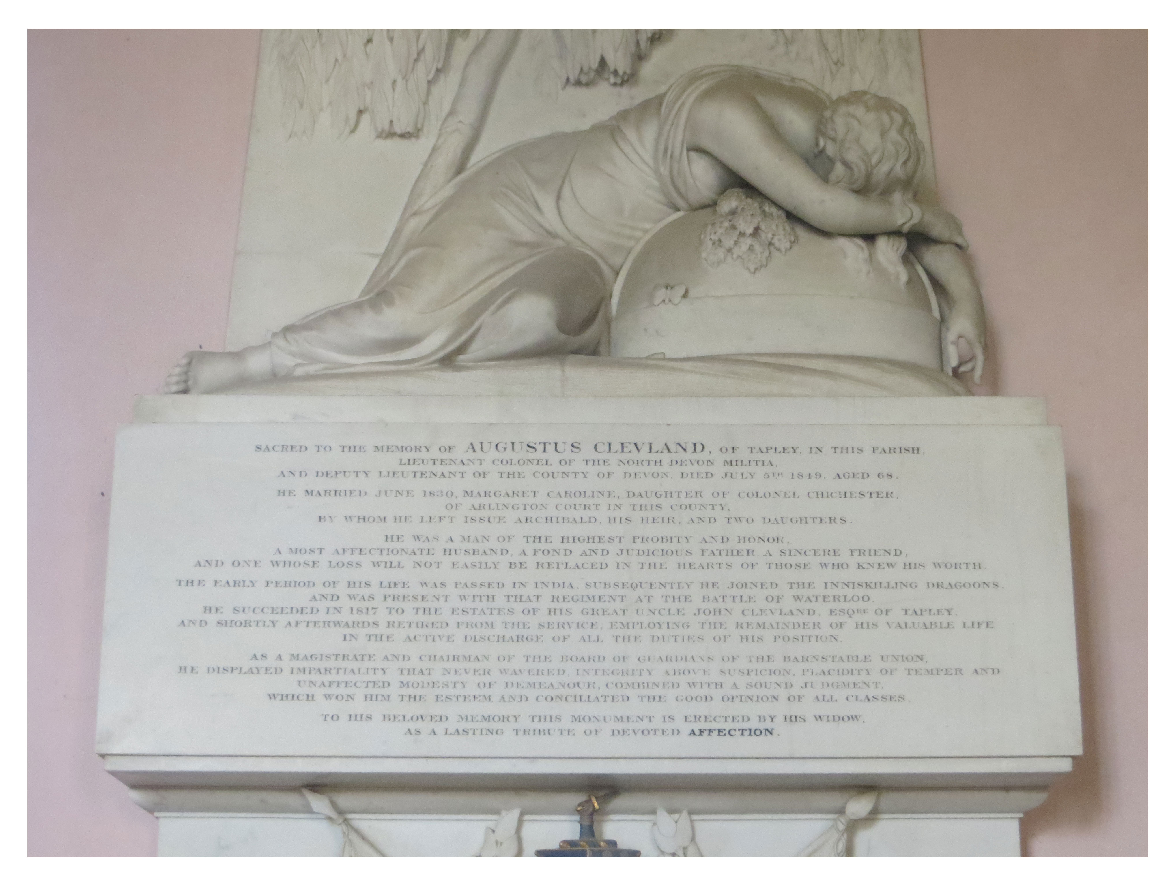 Sacred to the memory of AUGUSTUS CLEVLAND of Tapley in this parish, Lieutenant Colonel of the North Devon Militia and Deputy Lieutenant of the county of Devon. Died July 5th 1849 aged 68.
