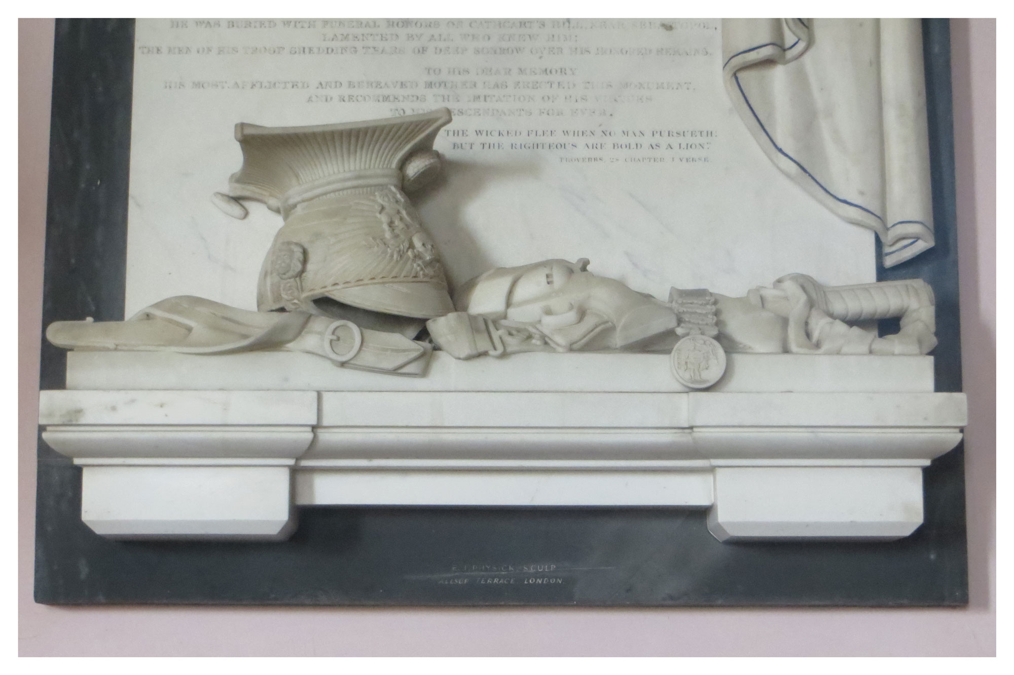 An inscription on the tablet in St Peter's, Westleigh (shown and discussed in detail below), states that he was buried on Cathcart's Hill. However, he is not recorded as such by Colborne and Brine in their The Last of the Brave.