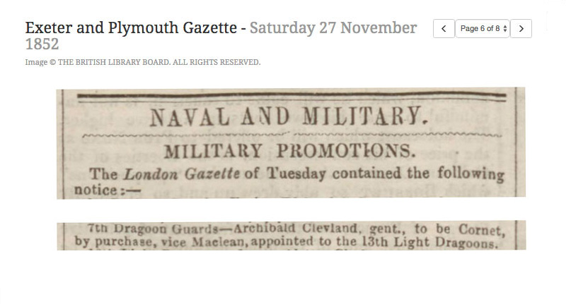 Cornet in the 7th Dragoon Guards: 23rd of November 1852 [aged 19].