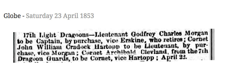 Cornet in the 17th Lancers: 22nd of April 1853.