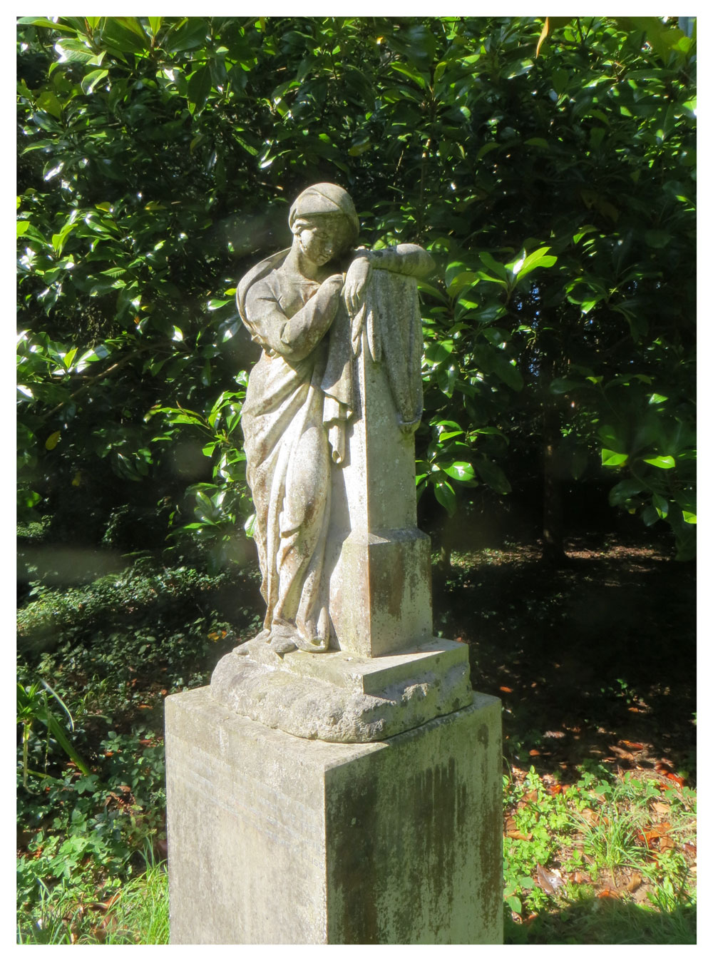 In 1982, EJB wrote that "there is is a small draped obelisk [pillar?] memorial in Tapely Park consisting of a stone base, some 4 feet high, surmounted by a female figure resting her head on her forearm. The inscription records that this was placed on a site chosen by Archibald Clevland as a young man. Whether this is the pillar erected by local inhabitants previously known to have been in the Park, but said to have fallen down, cannot be confirmed."