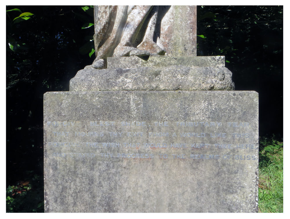 And stayed thy progress to the realms of Bliss.[PB: Having viewed and photographed the original (August 2015), I have corrected the punctuation. It is the opening stanza of a poem by Anne Steele, c.1770, that appeared in a number of mid-19th century hymnals including Ellen Courtauld's Psalms, Hymns, &c,, 1853. See e.g. http://www.hymnary.org/text/forgive_blest_shade_the_tributary_tear for more. Who is it dedicated to — Archibald or his father Augustus?]