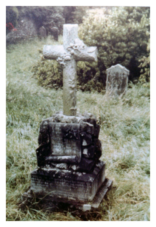 The memorial stone over his grave consists of a shaped block, surmounted by a small cross, the latter being finished in a simulated wood bark texture and has a carved wreath of leaves and flowers diagonally across the arms.