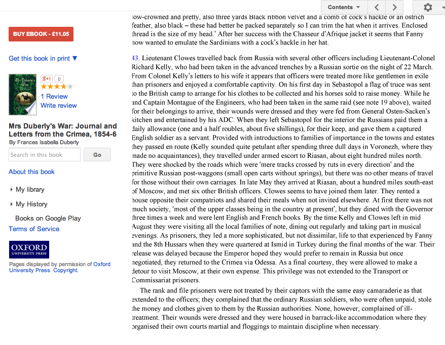 By the time Kelly and Clowes left in mid-August they were visiting all the local families of note, dining out regularly and taking part in musical evenings. As prisoners, they led a more sophisticated, but not dissimilar, life to that experienced by Fanny and the 8th Hussars when they were quartered at lsmid in Turkey during the final months of the war. Their release was delayed because the Emperor hoped they would prefer to remain in Russia but once negotiated, they returned to the Crimea via Odessa. As a final courtesy, they were allowed to make a detour to visit Moscow, at their own expense. This privilege was not extended to the Transport or Commissariat prisoners.