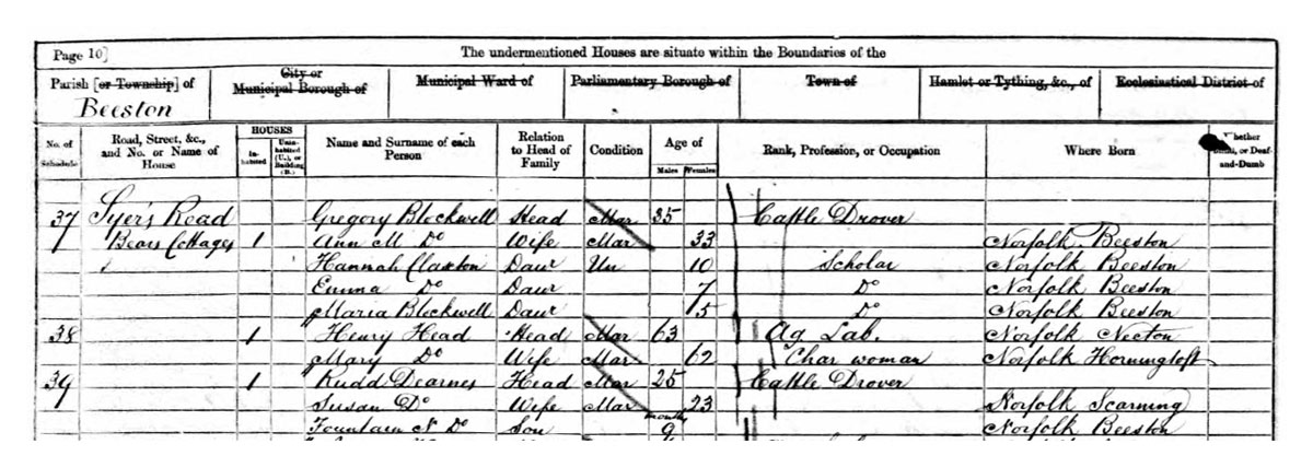 Rudd Dearnes, Head, Married, 38, Sheppard [sic], born Beeston, Norfolk.