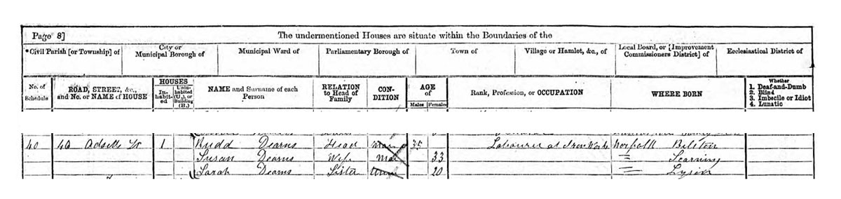[PB: By 1871, Rudd and Susan Dearns had moved away from rural Norfolk, to Sheffield, where he worked as a Labourer in an Iron Foundry in Brightside, Sheffield, an area that was undergoing rapid industrialisation and population growth at this time. See e.g. Wkipedia: Brightside, Sheffield. There is a detailed guide to sources of local history drawn up by Sheffield Libraries and Archives here.