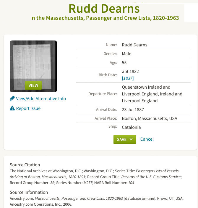 [PB: Did Rudd Dearnes emigrate in 1887 to the US on the Cunard Steam-Ship Company's SS "Catalonia", arriving at Boston from Liverpool (via Queenstown, Ireland) on 23rd of July 1887? This seems rather late in life (RD was in his 50s), but not impossible.