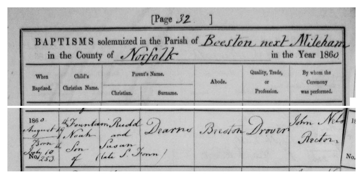 [PB: A son, Fountain Noah, was born to Rudd and Susan Dearns [nee Fenn?] on July 10th 1860, and baptised August 19th at Beeston next Mileham. Rudd Dearns was at this time a "Drover".