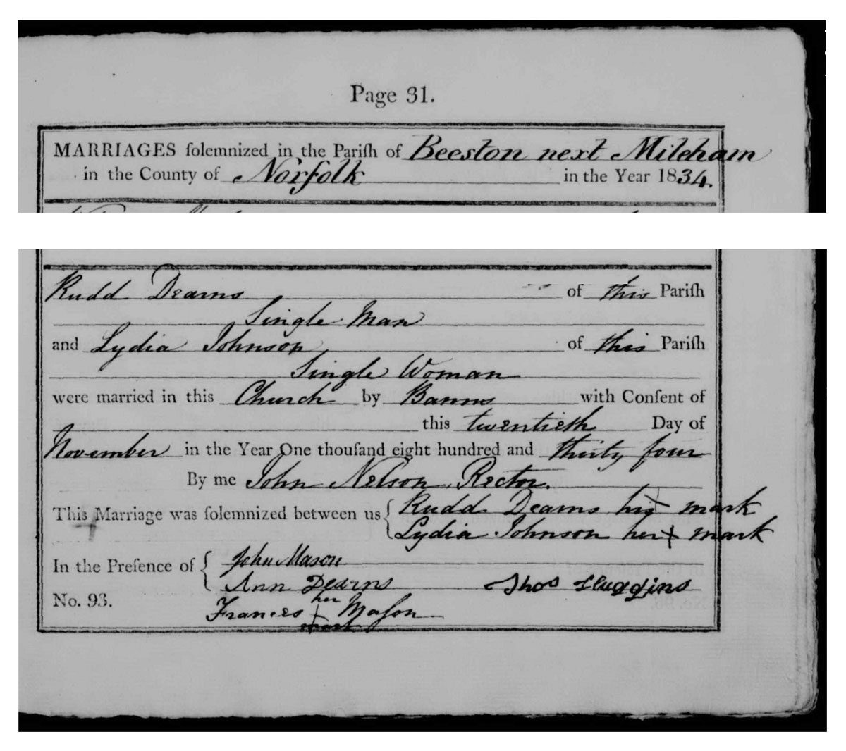 [PB: In 1841, Rudd Dearnes [father], aged 25-29, can be found in the household of Thomas Claxton and his family, in Wendling, Norfolk.