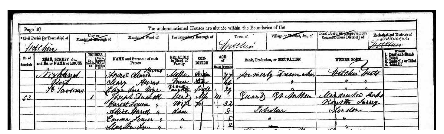 By 1891 he was a "Railway Guard", aged 61, living with his wife, Harriett Duckett, 33, born Surrey, and his daughter Martha H. Duckett, 22, born Middlesex.