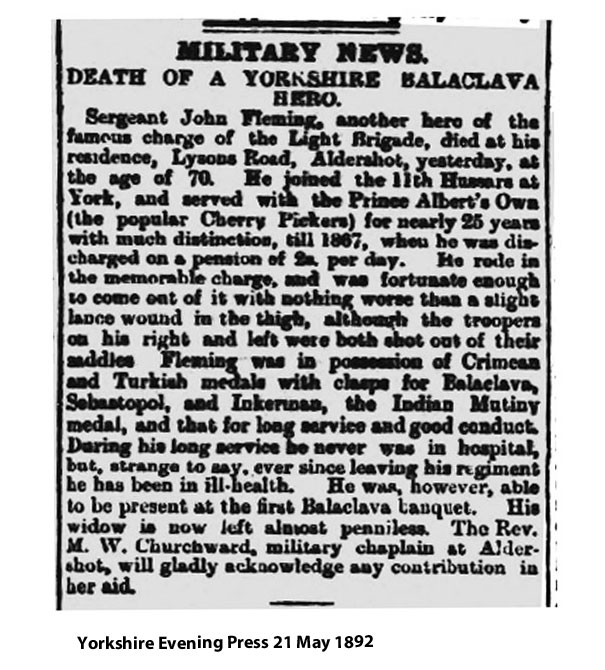 "Sergeant John Flaming [sic?], another hero of the famous charge of the Light Brigade, died at his residence in Lyons Road, Aldershot, on the 20th inst., at the age of 70.He joined the 11th Hussars at York and served with that regiment for nearly twenty-five years until 1867, when he was discharged with a pension of 2/- per day. He rode in the memorable Charge, and was fortunate to come out with nothing more than a slight lance-wound on the thigh, although the troopers on the right and left of him were shot out of their saddles.