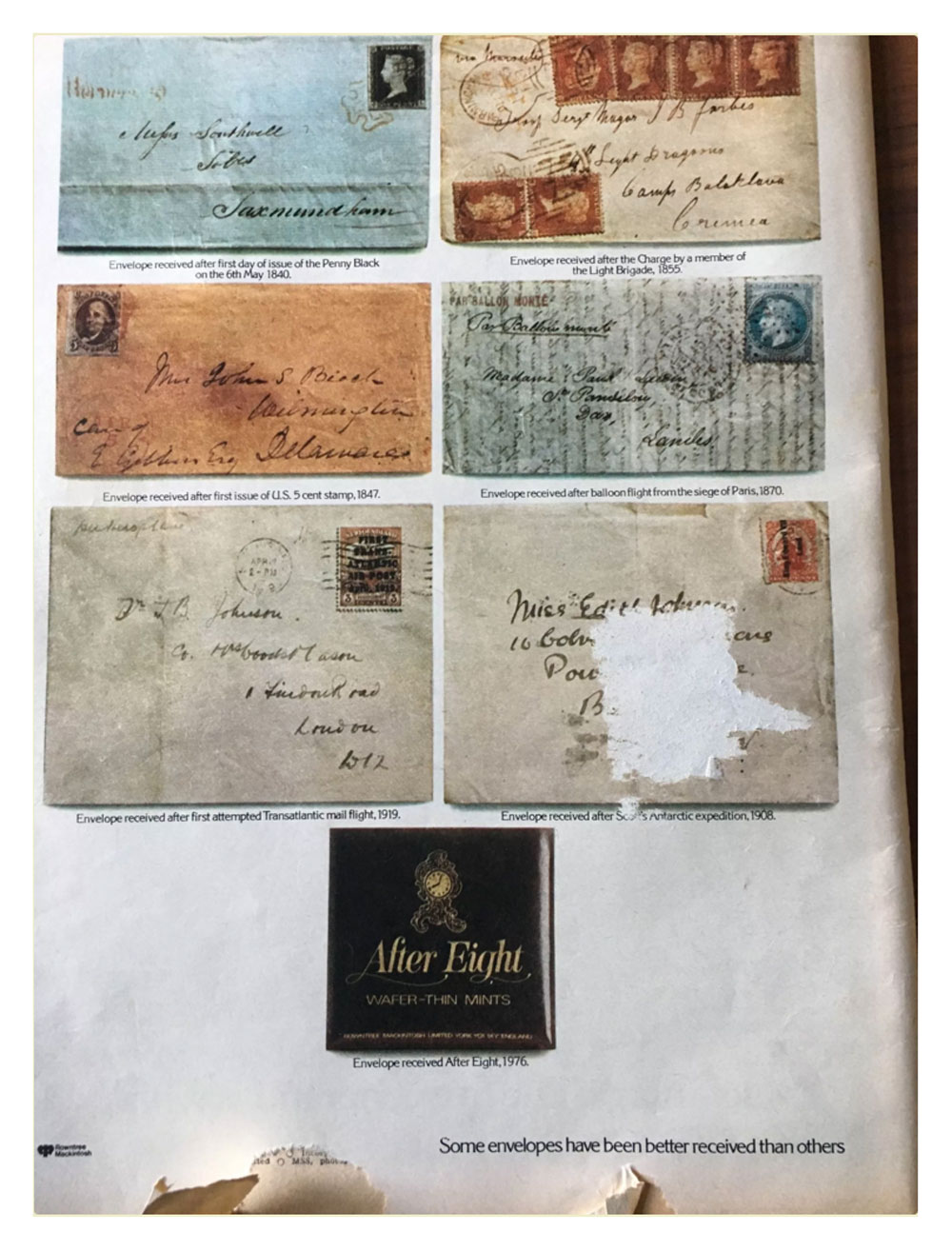 In December 1976 an advertisement appeared in the Radio Times for a brand of chocolate sold in an envelope type of pack. The theme of this advert was based on illustrations of old postal envelopes and covers. One of these was addressed to "Troop Sergeant Major J.B. Forbes, 4th Light Dragoons, Balaclava Camp, Crimea." Enquiry of the advertising agent revealed this to be only the envelope — there was no letter. (See copy of this in the 4th Hussar file.)