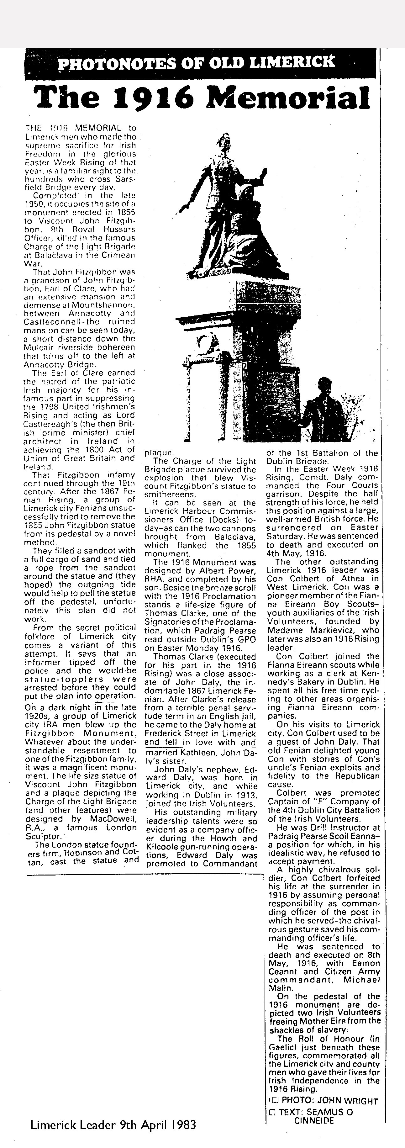 — "The 1916 Memorial: Photonotes of Old Limerick", Seamus O Cinneide, Limerick Leader, 9 April 1983.