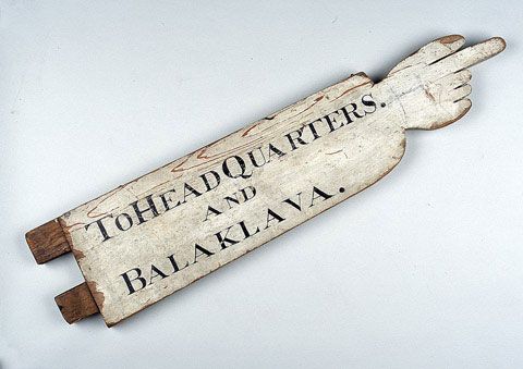 Wooden sign post, 'To Headquarters and Balaklava', 1854.
