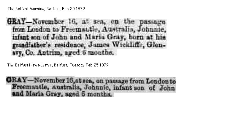 [PB, August 2015: Thanks to Wendy Leahy it is now known that John Lewis Gray died as an infant on 16th of November 1878 during the journey back to Fremantle. Reports of "Johnnie's" death appeared in Belfast newspapers three months later, on 25th February 1879.]