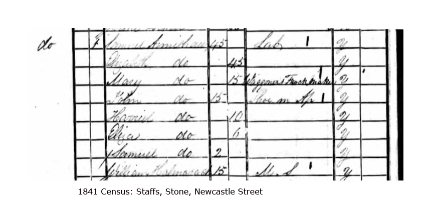 In 1841 WH was living with the family of Samuel Annishaw, 45, a Labourer, with his wife and 5 children. Many of their neighbours made shoes.