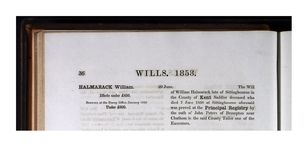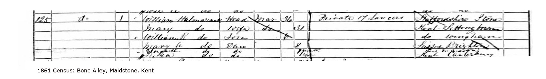 [PB: This is odd. "Halmarack" is an unusual name, yet here is a "William Halmarack", Saddler, of Sittingbourne, Kent, who died 7 June 1858. (Saddlery is obviously a cavalry-related trade.) So was this William's father moved down from Stone? Unlikely but not impossible. Mary came from Sittingbourne — so were she and her husband William related e.g. cousins?]