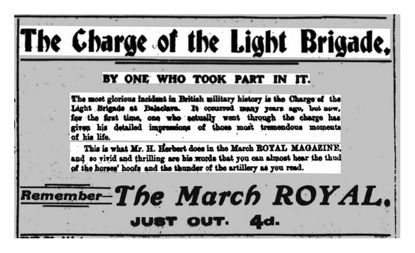 James Herbert's account of the Charge appeared in the Royal Magazine in March 1905 and was reprinted, with several illustrations, in ? Wood, Survivors' Tales of Great Events, [CHECK & ADD DETAILS & LINKS].