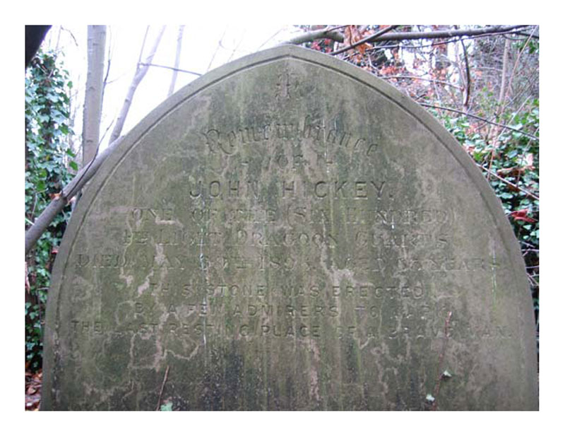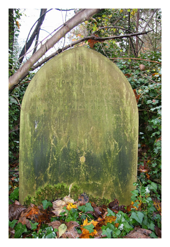 In order to find John Hickey's grave, go to the memorial to William French (q.v.) on Church Road South, near the St Pancras Chapel. Follow the path to the right of William French's grave for about twenty-five yards. On the left of the path is a gap between the graves of Charlotte and Alice Chapman, and Edward Turnbull. John Hickey is three rows behind them, on the left and hidden by the tombstone of Henry and Martha Plumley.