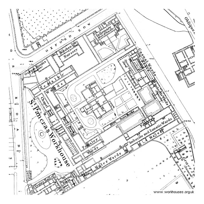 [PB: The magistrate adjourned the case for a month, but I don't know whether he ever made a judgment — I have not found later newspaper reports. So what happened to John Hickey? Did this court case bring about his mental collapse? Presumably he was taken to what are marked as the "lunatic wards" on contemporary plans of the St Pancras workhouse. Was he ever released to the wider community, or only back to the workhouse wards he had previously lived in? Is there any extra information in his death certificate? I have not been able to locate the address "4 St Pancras Terrace", but it seems likely it was still part of the St Pancras Workhouse (many of whose buildings still exist and are now part of St Pancras Hospital). ]