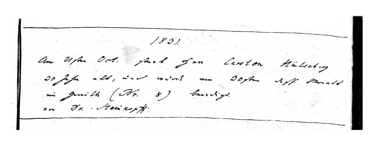 The death of a Carston Hulseberg is recorded in the German Lutheran Church, Savoy, London, in 1831.