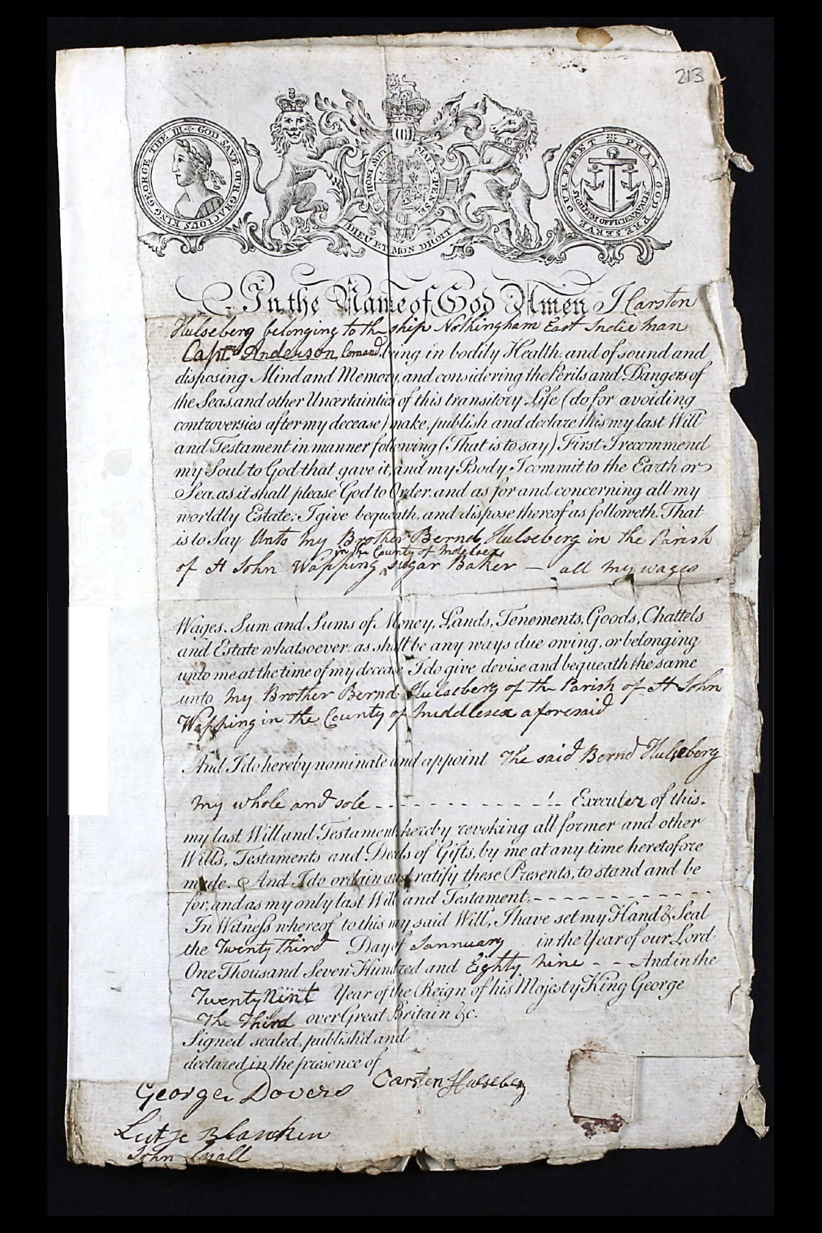 In addition, a "Carston Hulseberg" wrote a will, dated 23rd of January 1789, leaving everything to his brother, Bernard, a "sugar baker" in Wapping. The basic will is pre-printed with additions in pen. (Note the anchor emblem top right, "Pray God Preserve Our Fleet", which presumably a standard-issue will-form for sailors?). The handwriting is a little awkward and hesitant, with mispellings ("Jannuary") and amendments. The occasion for writing the will appears to be because Carston was setting out on an East Indiaman ["Indieman"], the Nottingham ["Nothingham"?], commanded by Captain Anderson.