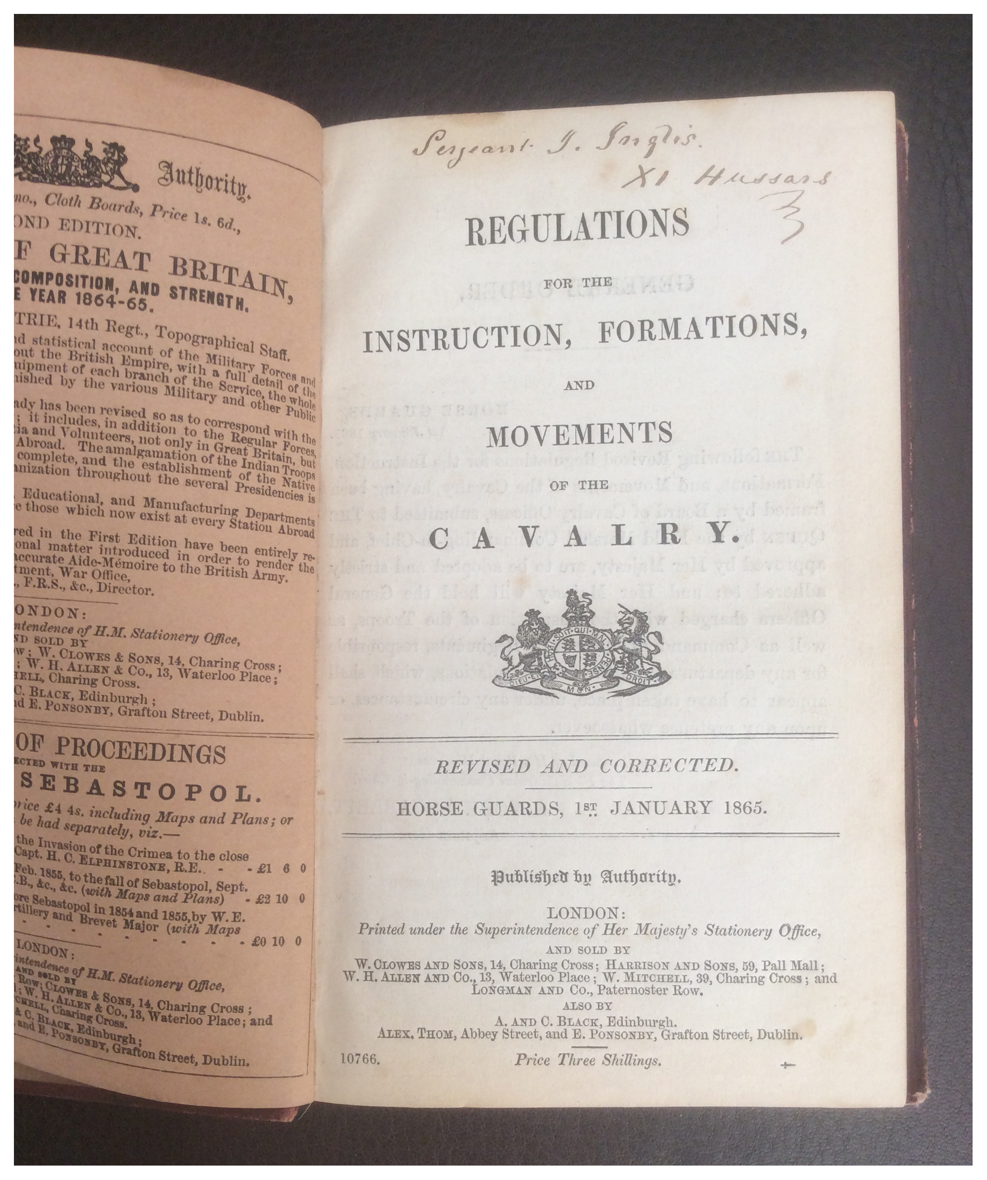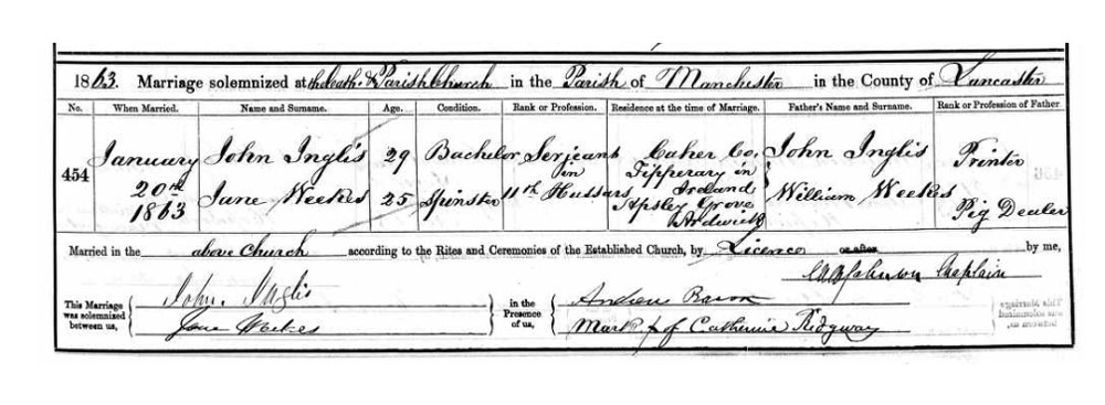 John Inglis, 29, Bachelor, Sergeant in 11th Hussars, resident in Caher, Co. Tipperary in Ireland, Father's name John Inglis, Printer.