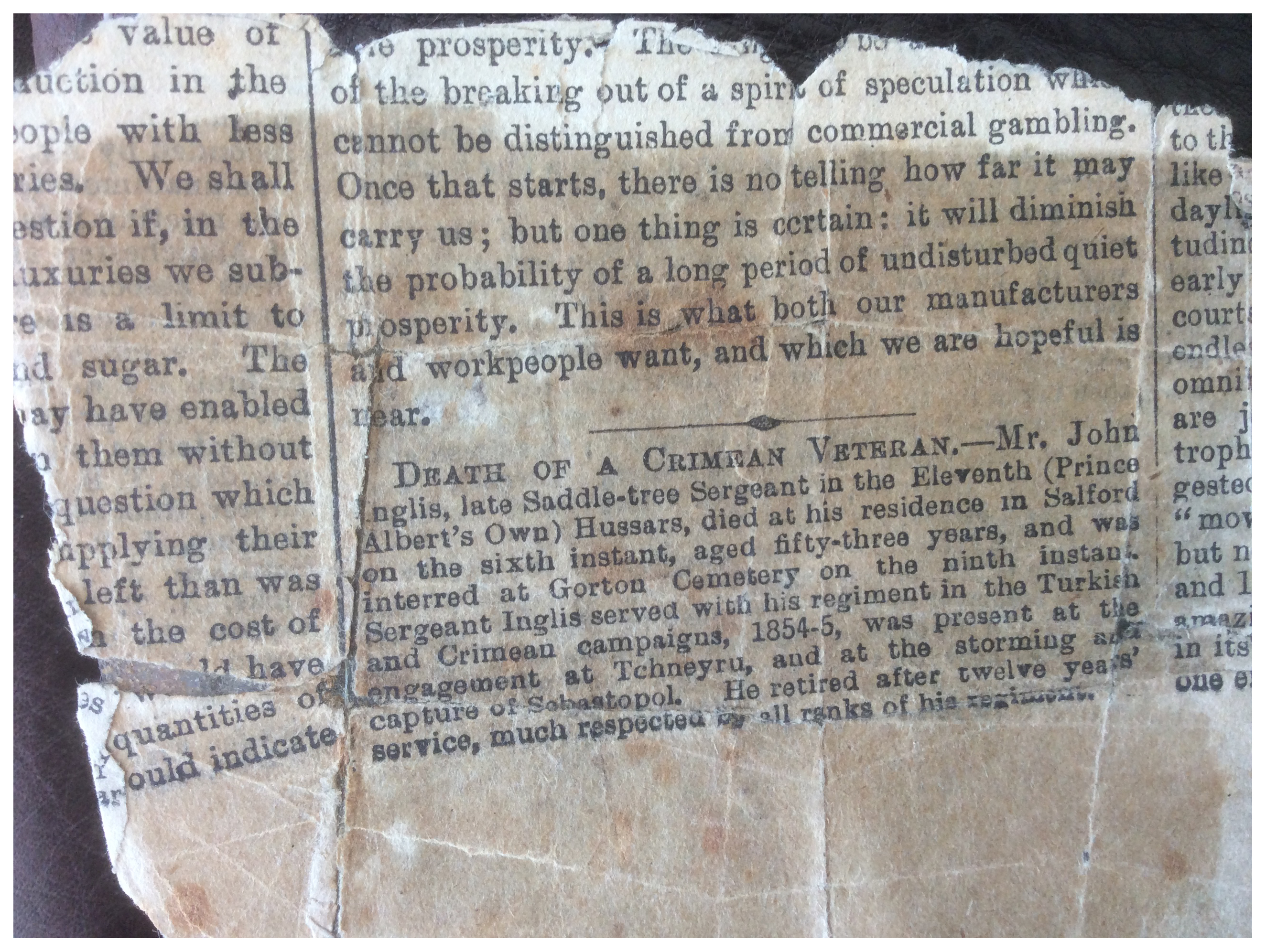 [PB: In March 2016, we were delighted to be contacted by John Inglis's great-granddaughter, Pat Ford (nee Inglis), who has a number of his possessions, including his original discharge documents (parchment certificate) and Cavalry regulations book. She also has a photograph of him in uniform and a photograph of his grave. She said that John was in a home after the death of his parents, and his brother was in the Bluecoates School [sic? in York?]. Both travelled from York and were in lodgings together (see the 1851 Census).]