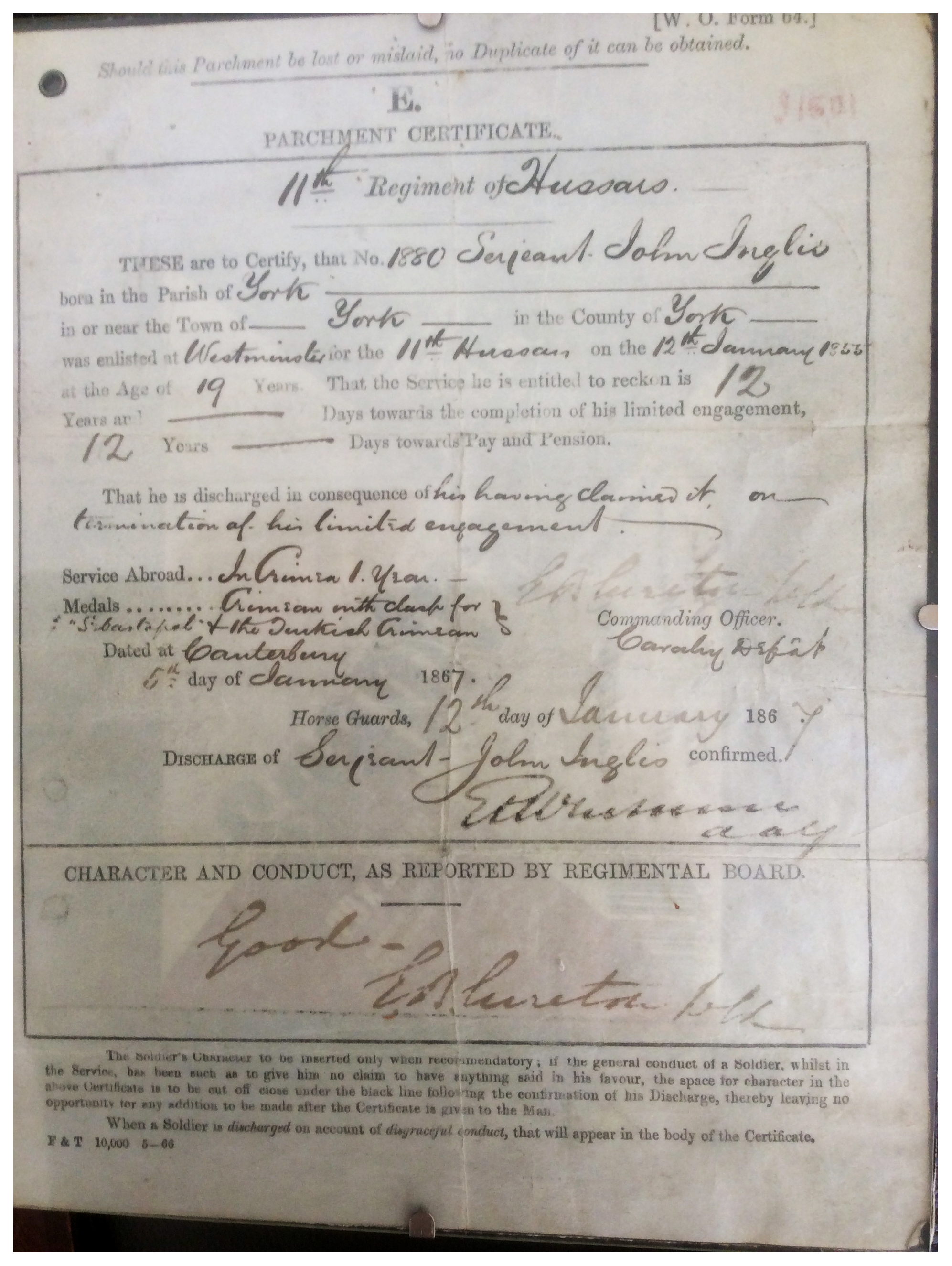 When the regiment went to India, 23rd of July 1866, John Inglis was sent to the Depot at Canterbury and discharged shortly after.