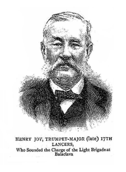 "17th Lancers — In the grave-yard of Chiswick Parish Church on the 19th of August were conveyed to their last resting-place the remains of Henry Joy. Joy, as the Staff Trumpeter to Lord Raglan [sic] sounded the advance for the famous Balaclava Charge. The coffin, which was of polished oak, bore the inscription, "Henry Joy. Died Thursday, August 17th 1893, in his 75th year." The Revd. N.W.T. Dale, of Chiswick, officiated. The mourners included the two sons and four daughters of the deceased."