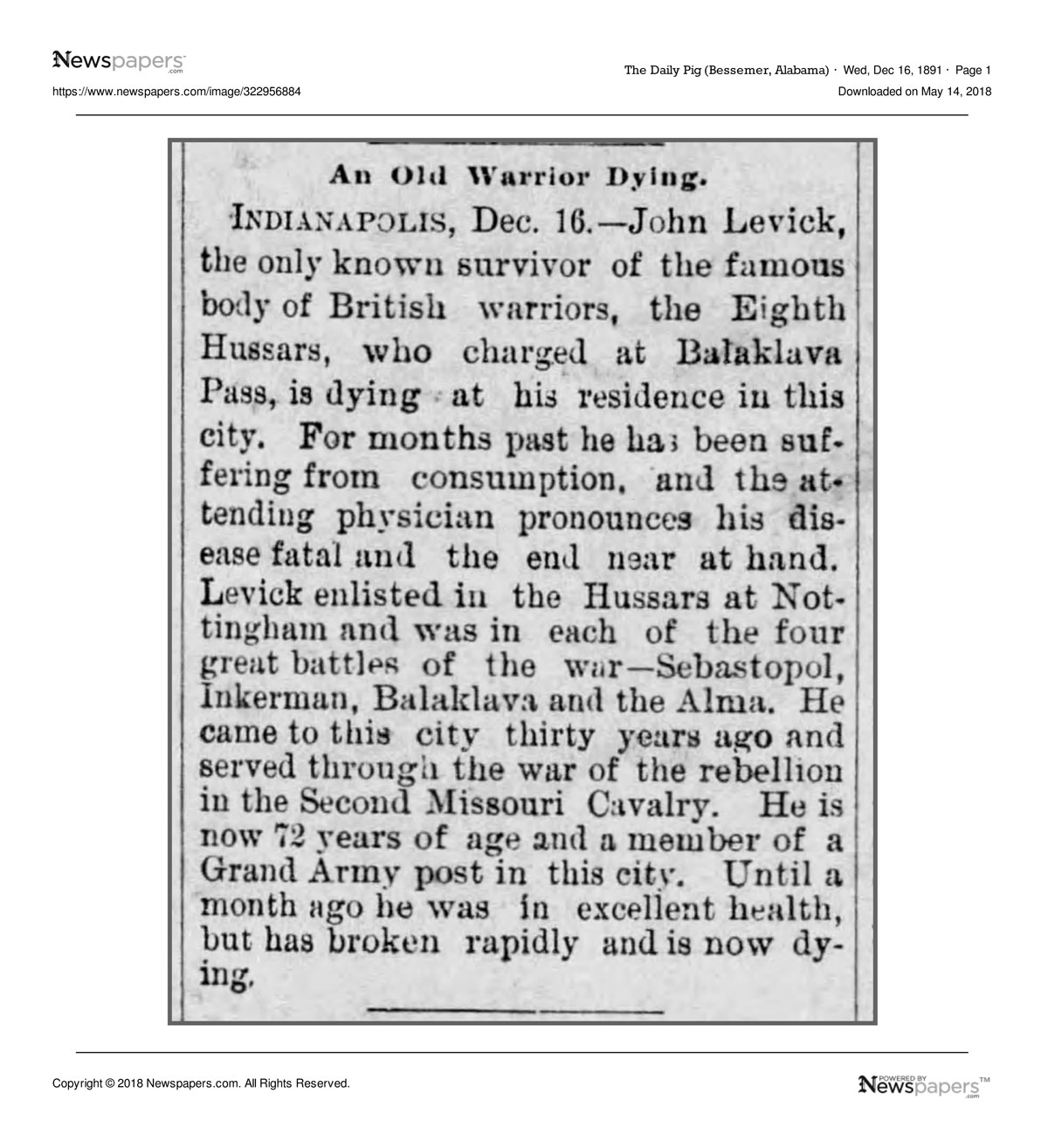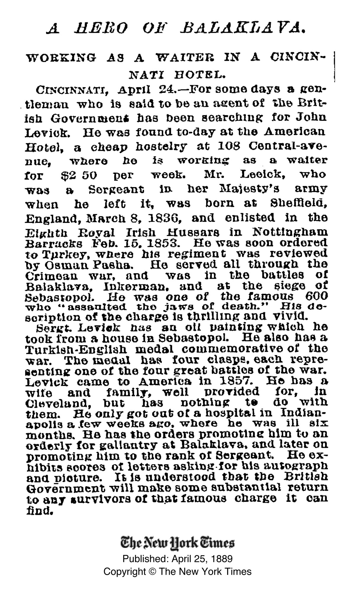 "In last Saturday's issue [exact date?] you refer to an agent of the British Government searching for the whereabouts of John Levick, whom you say served all through the Crimean War. With your permission I wish to give you and your readers a little insight into the doings of the aforesaid British Government respecting the noble 600. John Levick was well known to me. He was a sergeant for some time in the 8th Hussars. I am rather surprised to hear that the British Government are so anxious to make "some substantial return to any survivors of that famous charge." If they intend to do anything, they had better do it quickly, for up to the present they have shown to such survivors nothing but studied neglect...