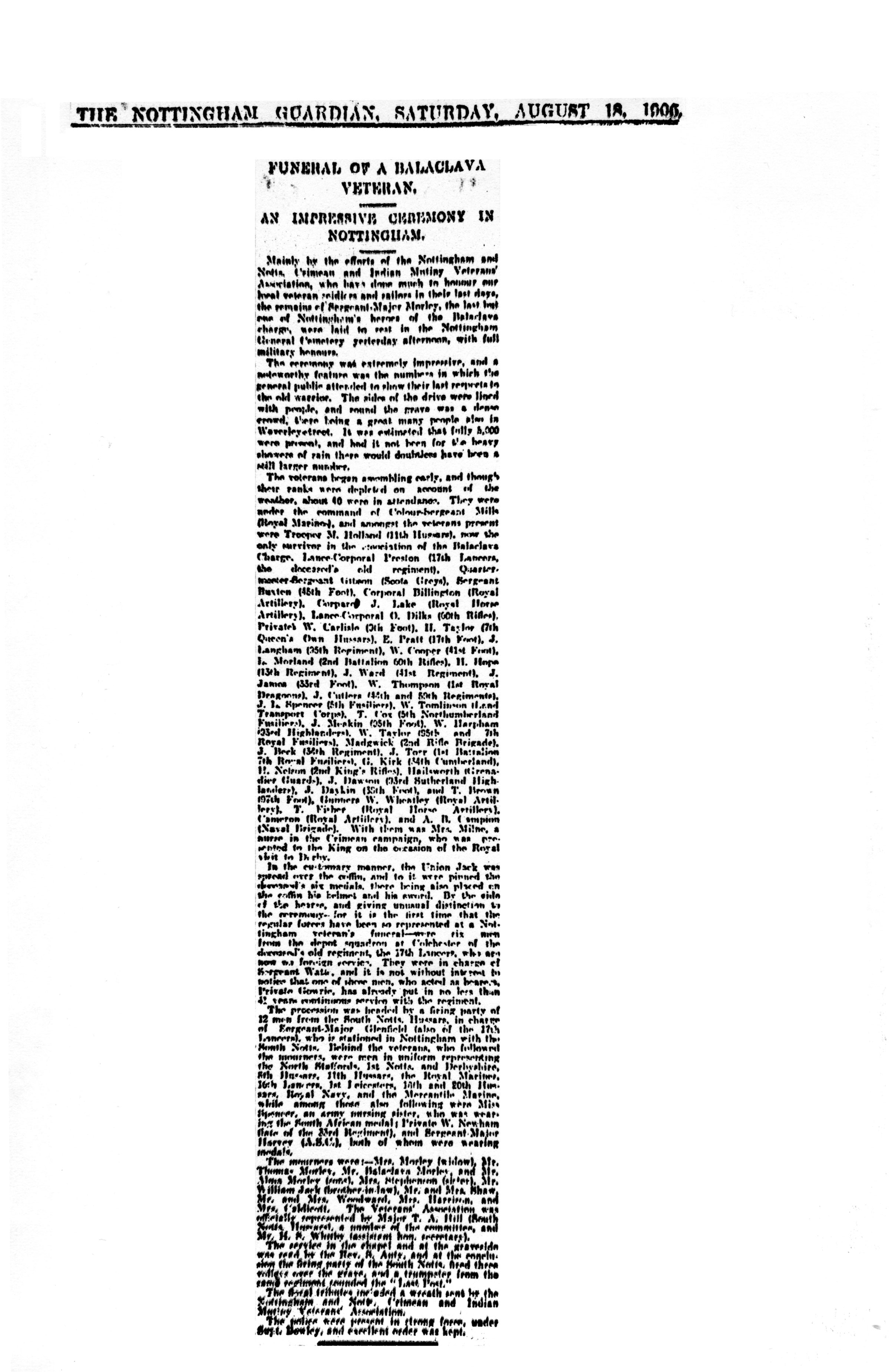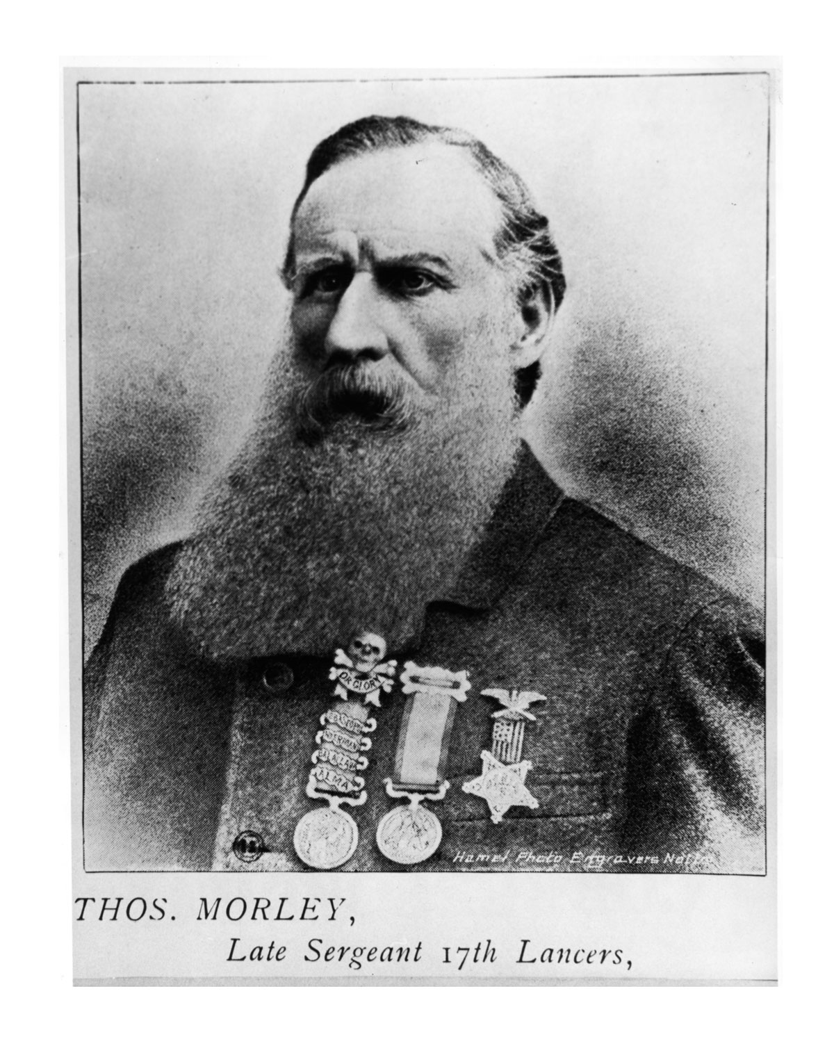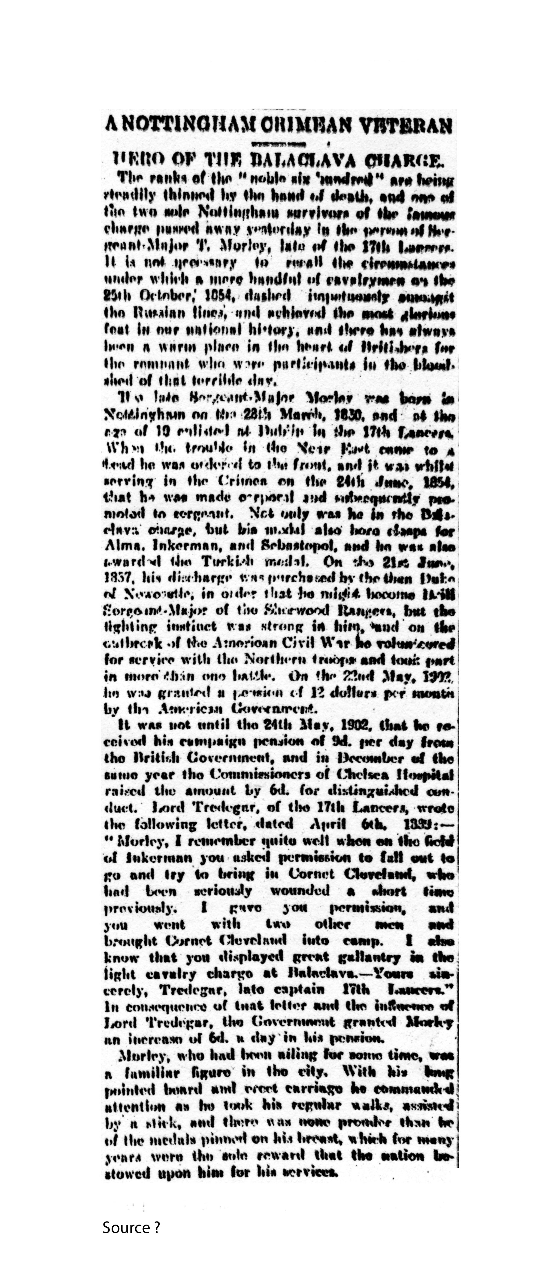 "Sergeant-Major T. Morley, of the 17th Lancers, who fought at Alma, Balaclava, and Sebastopol, and who was one of the few survivors of the famous Charge of the Six Hundred, died at Nottingham. He was buried with military honours, six members of his old regiment carrying the coffin, to the front of which his medals were attached."