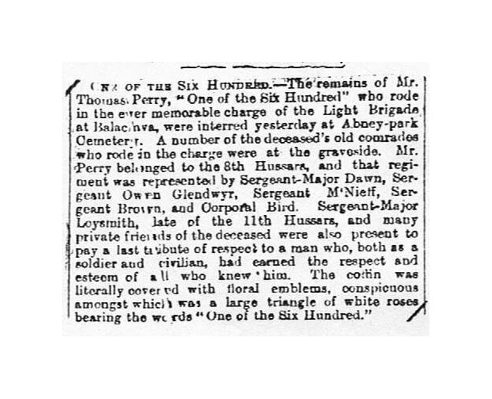 [Along with a number of former Light Brigade soldiers (including Dawn, Glendwyr, Brown, Bird and Loy Smith) he attended the funeral of 597, Thomas Perry, 8th Hussars, at Abney Park Cemetery in 1884.]