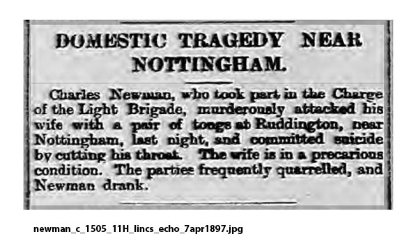 Charles Newman, who took part the Charge of the Light Brigade, murderously attacked his wife with pair of tongs at Ruddington, near Nottingham, last night, and committed suicide by catting his throat. The wife is in a precarious condition. The parties frequently quarrelled, and Newman drank. (Lincolnshire Echo, 7th April 1897)