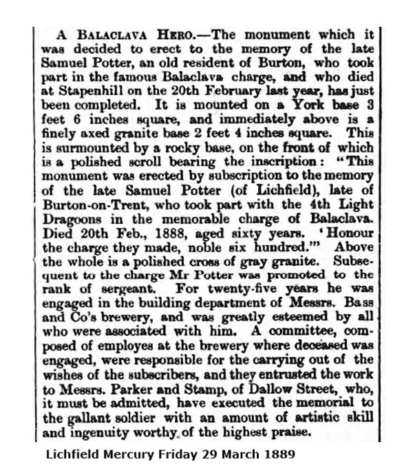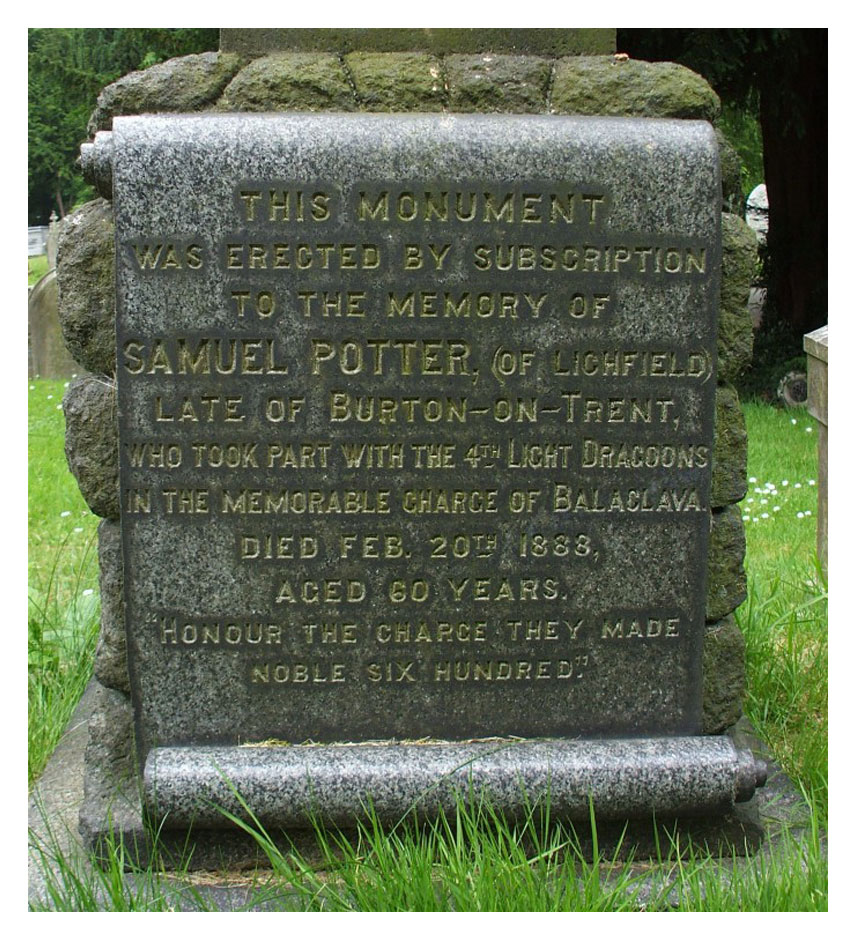 This monument was erected by subscription to the memory of Samuel Potter (of Lichfield) late of Burton-upon-Trent, who took part with the 4th Light Dragoons in the memorable charge at Balaclava. Died February 20th 1888, aged 60 years.