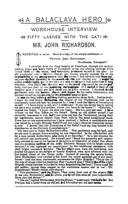 While he was in Crumpsall Workhouse at Manchester during the latter part of his life, he was the subject of an interview by a journalist for Spy magazine, later published in pamphlet form as "A Balaclava Hero. Workhouse Interview. Fifty lashes with the cat! Mr John Richardson".