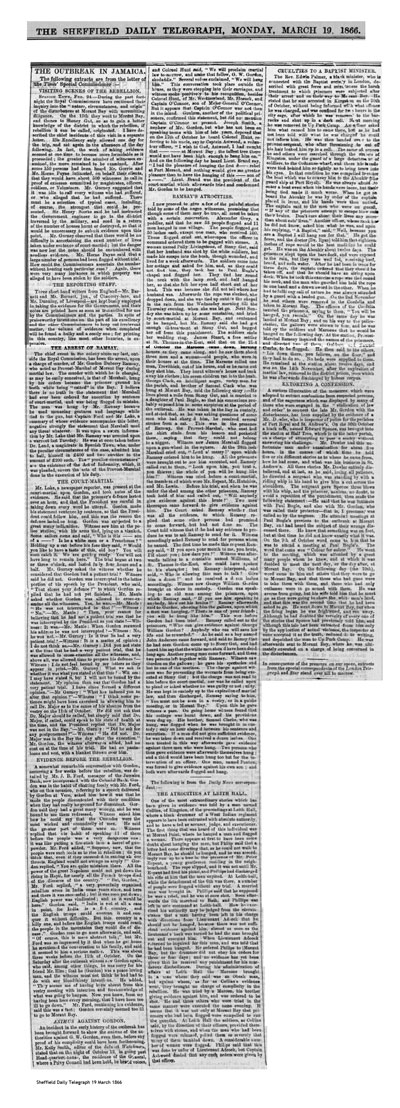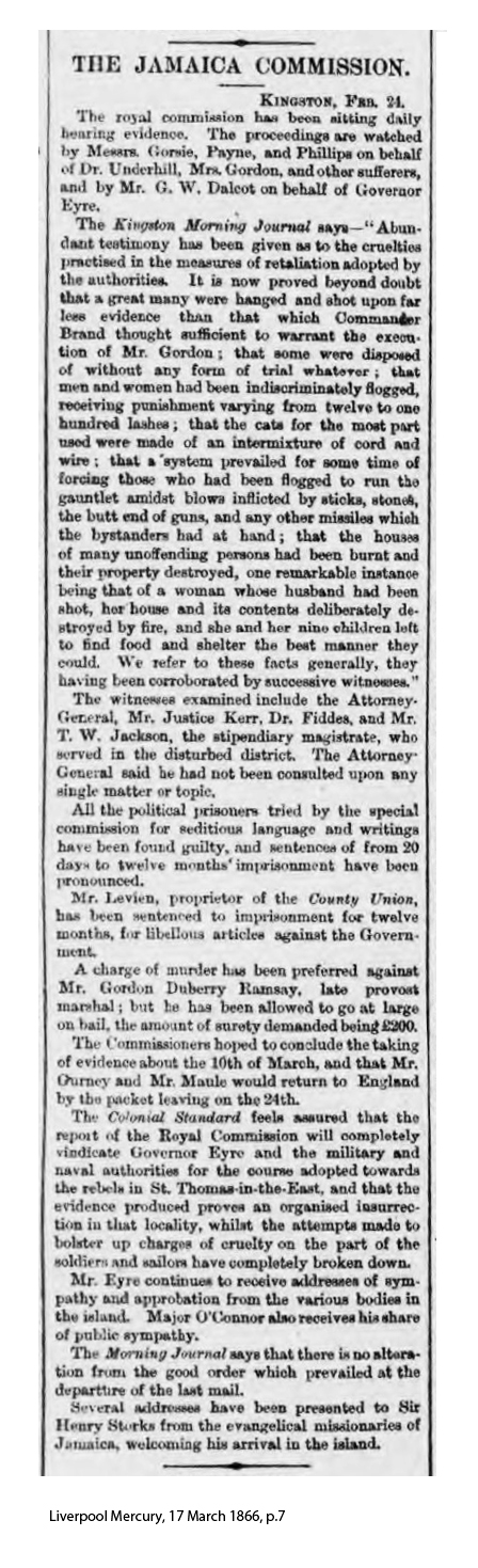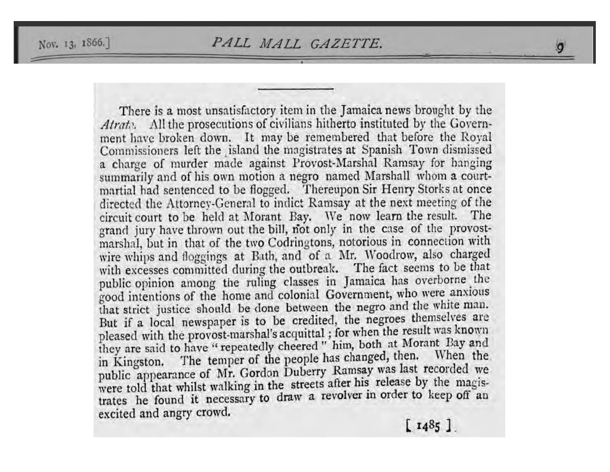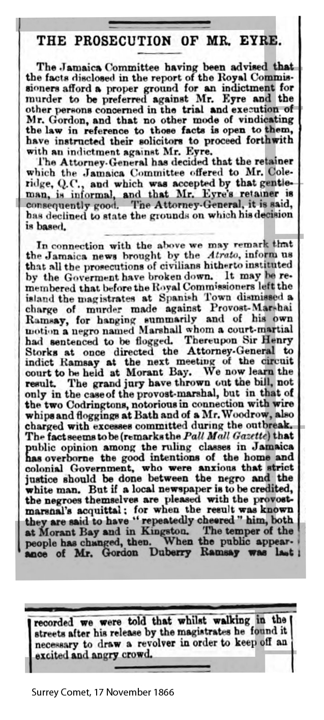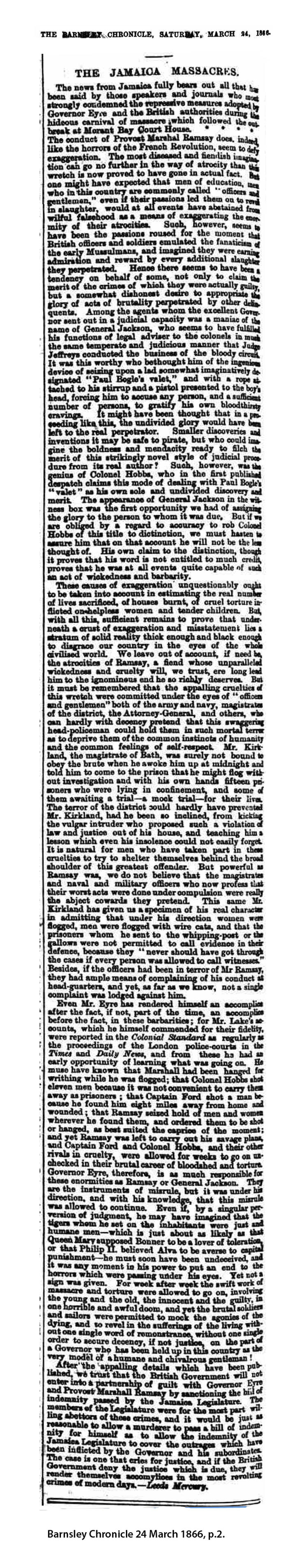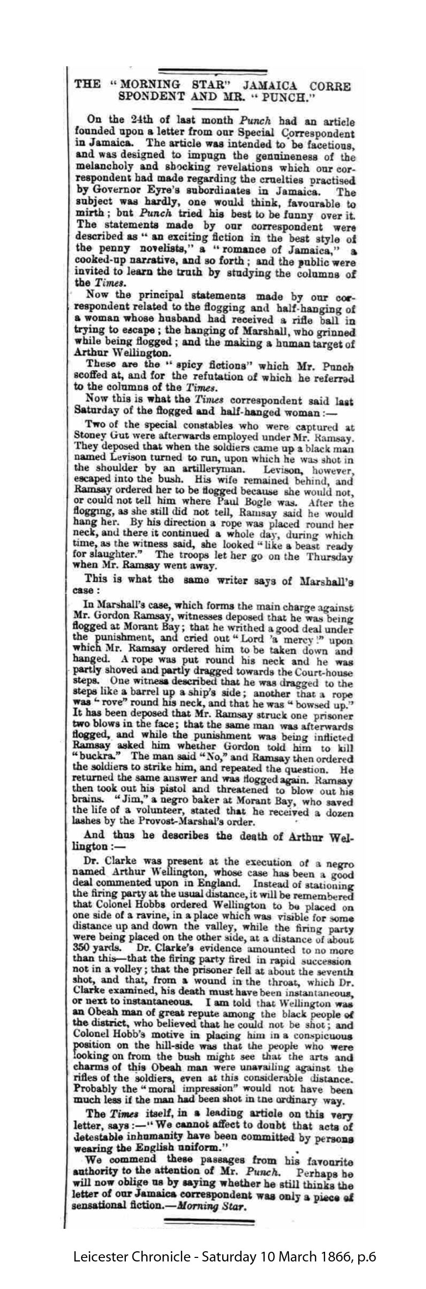 The Leicester Chronicle, Saturday 10 March 1866, quoted at some length a letter from Jamaica [with evidence that rebutted] Punch magazine's "facetious" article about the events in Jamaica, some of the worst of which involved Ramsay: