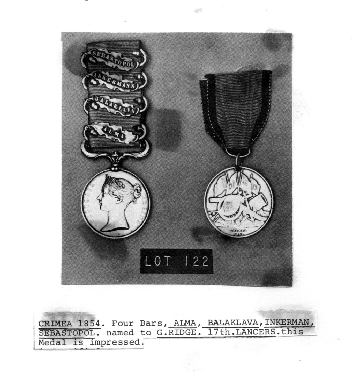 Entitled to the Crimean medal with clasps for Alma, Balaclava, Inkerman, Sebastopol, and the Turkish medal.
