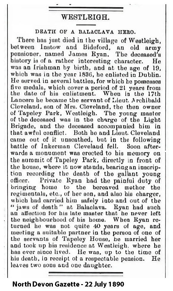 "There has just died in the little village of Westleigh, between Instow and Bideford, an old Army Pensioner named James Ryan. The deceased's history is of a rather interesting character. He was an Irishman by birth, and at the age of 19, which was in 1836, he enlisted at Dublin. He served in several battles and for which he possesses five medals, which cover a period of 21 years from the date of his enlistment.